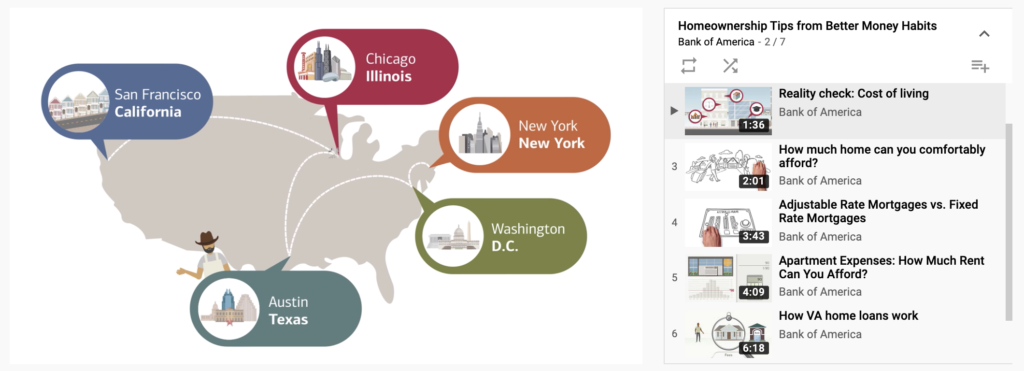 Bank of America is an excellent example of showing short, engaging videos on specific topics that include data in a visual way. Many videos are under five minutes, which is long enough to give detailed information but short enough to keep the audience’s attention. Their Homeownership Tips from Better Money Habits playlist of videos is one example: