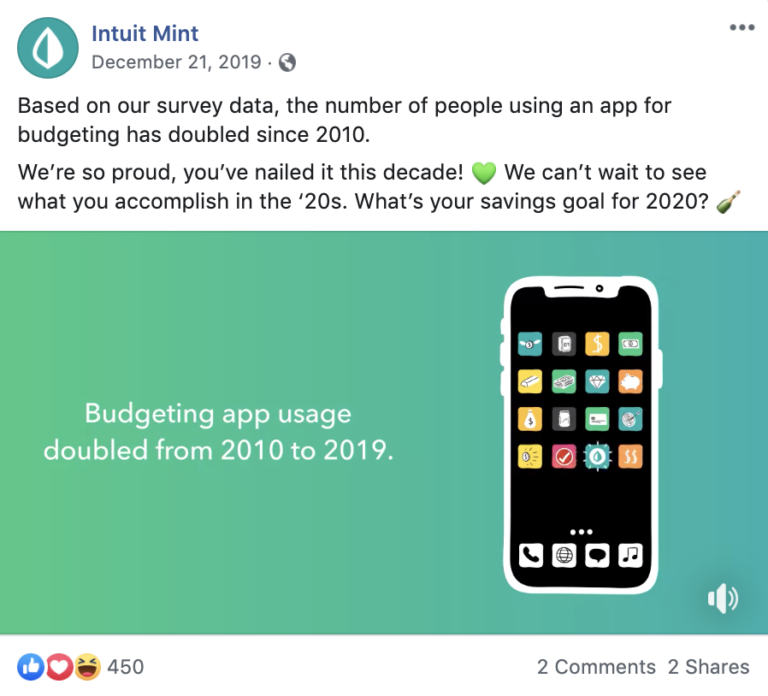 Mint’s Facebook page shows how visuals can encourage likes, clicks and shares. They often share budgeting stats and tips as photos or videos. Below is an example of one animated video about their app usage.