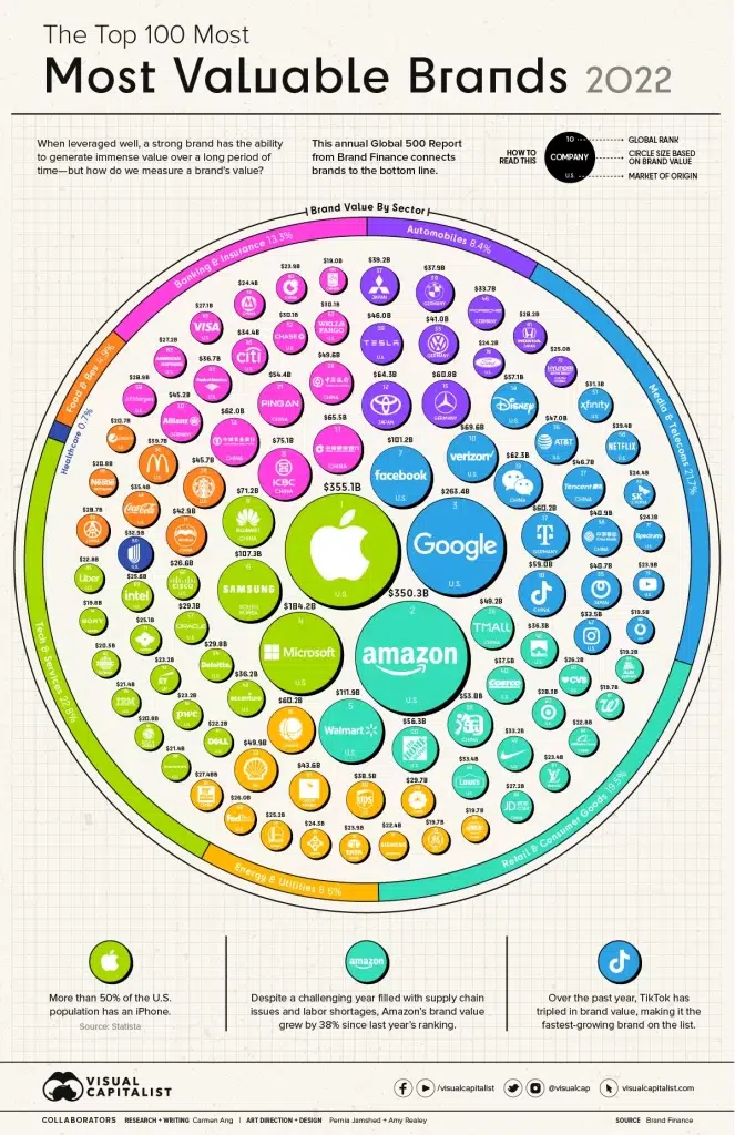 For example, Visual Capitalist recently published an infographic on the top 100 most valuable brands in 2022 that captures the value of different brands based on their market sectors: