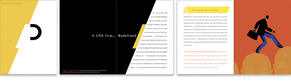 In 2004, Steve Piascik came to us needing help in developing their brand. This wasn’t your ordinary CPA firm. They leaned into the notion that “Big is good. Smart is better.” and allowed us to create a brand and materials that stood out. Engaging illustrations, unique printing techniques, and bold language set the stage for their differentiating offerings in the sports, medical and international arena. Eight years later, they returned for an evolution of their brand. Recognizing that they were known simply as “Piascik,” we maintained the equity of their logomark by incorporating it into an updated logo. It is a brand that serves them well to this day.