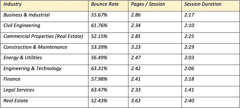 Using Google Analytics’ Benchmarking tool, we researched a few key metrics (bounce rate, pages per session, and session duration) for various industries. All of these statistics are based on properties from the USA that receive between 100-499 sessions, pulled from July 2018 – July 2019. You can see that these benchmarks vary from industry to industry, making it difficult to identify what a “good” benchmark is. It’s desirable to be competitive in your industry, but remember to focus on what makes your website different, capitalize on your individual strengths, and track your own growth.