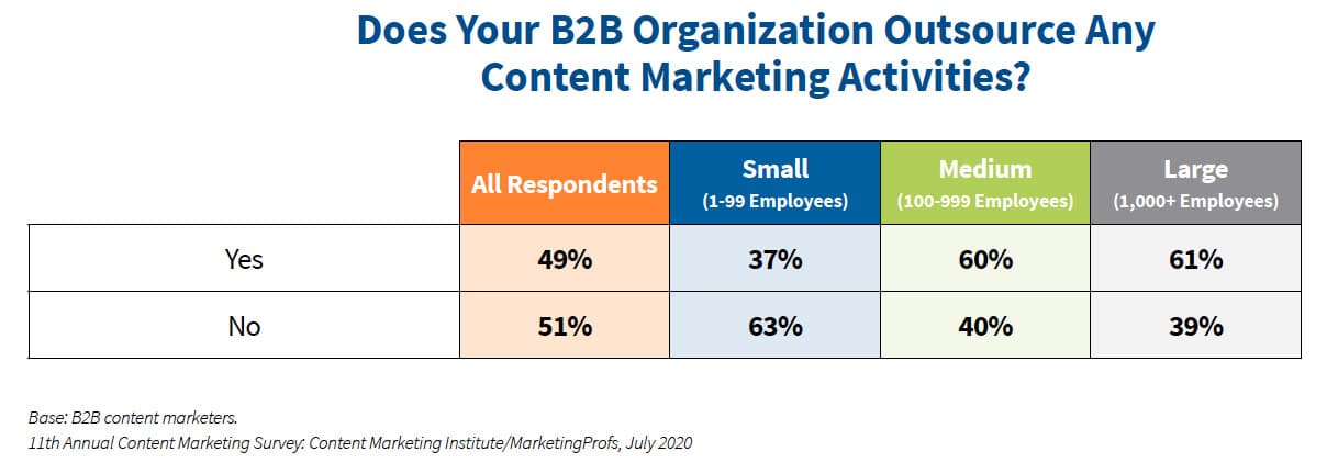 When asked about outsourcing, 49% of B2B marketers outsource at least one content marketing activity. Large firms are the most likely to outsource (61%), with small firms the least likely to outsource (37%). The activity most likely to be outsourced is overwhelmingly content creation (86%), regardless of company size, content marketing budget, or overall content marketing success. Interestingly, the top reported challenge for B2B marketers who outsource is finding partners with adequate topic expertise (69%).
